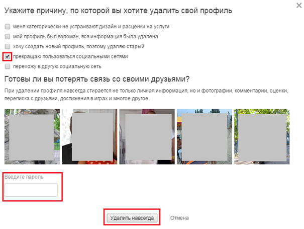Далее, вводим пароль от профиля и выбираем «Удалить навсегда», выполняя подтверждение удаления страницы.