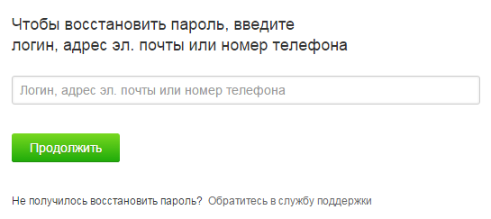 В первом поле для ввода появившегося окна можно ввести адрес электронной почты, номер мобильного телефона или логин. В случае ввода номера телефона, вы получите смс-сообщение, а в нём — инструкция дальнейших действий. При указании почтового адреса либо логина необходимая информация придет на электронку.
