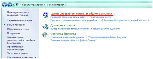 Вернув необходимые настройки в используемом браузере рекомендуется проверить параметры, используемого Интернет протокола. Для этого перейдите в Панель управления, где откройте вкладку Центр управления сетями и общим доступом.