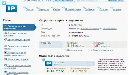 На сайте представлен широкий выбор ресурсов, в том числе, сервис для проверки скорости соединения. Для этого при переходе на главную страницу выбирается вкладка «Тесты», а затем в левом навигационном меню — «Скорость интернет соединения». Теперь указываются единицы измерения. Удобнее использовать «Мбит/сек", так как именно эти единицы измерения фигурируют в тарифных планах провайдера. Результате проверки выглядят следующим образом: