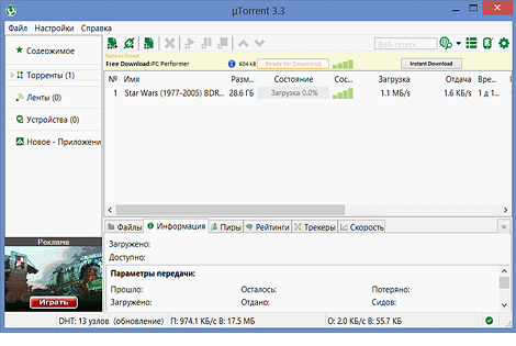 Это — еще один простой способ определения скорости. Для такой проверки находим на трекере файл, число раздающих у которого больше 1000, а скачивающих сравнительно немного. Ставим его загружаться, предварительно остановив все другие скачки в торрент-клиенте.