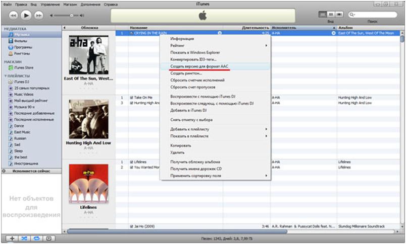 Теперь в медиатеке активируем контекстное меню файла путем нажатия правой клавиши мыши по его названию и выбираем команду «Создать версию в формате AAC» (рис. 9). После этого в медиатеке появится созданный рингтон, расположенный возле начального трека.