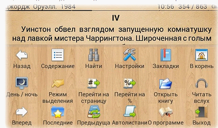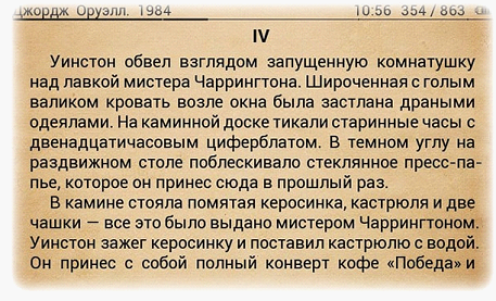 Cool Reader – понятная программа для чтения книг на Android, интерфейс которой принимает нужное читателю положение: вертикальное или горизонтальное. Такой вид у ридера во время работы.