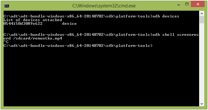 Дабы программа для записи происходящего на экране начала дублировать происходящее на дисплее в файл вводим: «adb shell screenrecord /sdcard/videorecord/filename.mp4», где videorecord – путь к файлу, filename – его название.