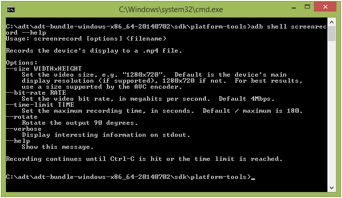 Для получения информации о параметрах конфигурации и методах их изменения читайте после ввода команды: «adb shell screenrecord — help» в консоль (два дефиса, а не тире).