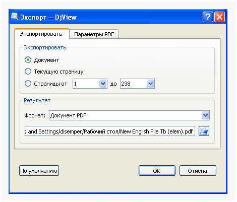 - Воспользуемся специальным сервисом: скачиваем преобразователь DjView. Установка простая, поэтому не будем на этом останавливаться. В готовом редакторе нажимаем «Файл», затем «Экспорт» и выбираем нужное расширение. В нашем случае PDF.
