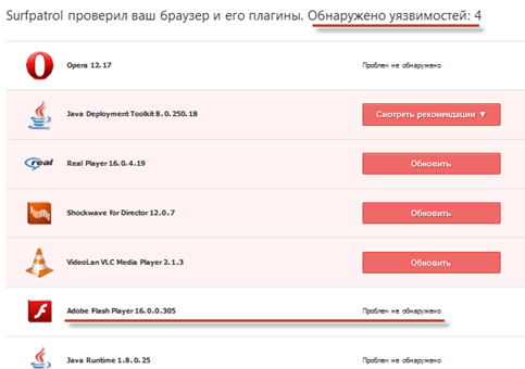 Сегодня разработано специальное расширение Surfpatrol для всех браузеров, которое отслеживает и информирует об устаревших версиях установленных программных продуктов.