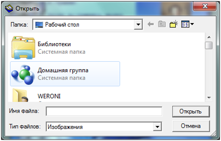 - Затем нажимаем под меню кнопку Открыть. Она выводит на экран окошко, в котором мы и находим нужную картинку.