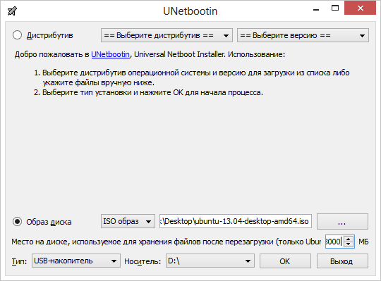 - Unetbootin предложит Вам выбрать дистрибутив или образ диска, который Вы собираетесь записать. Выбирайте второй вариант – образ диска;