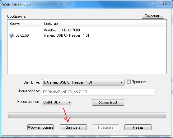 Накопитель автоматически отформатируется, если это не было выполнено заранее. А потому, все данные с нее необходимо пересохранить во избежание их потери. На период записи от компьютера рекомендуется отключить все остальные накопители. По умолчанию утилита использует метод записи USB-HDD+, изменять его не стоит.