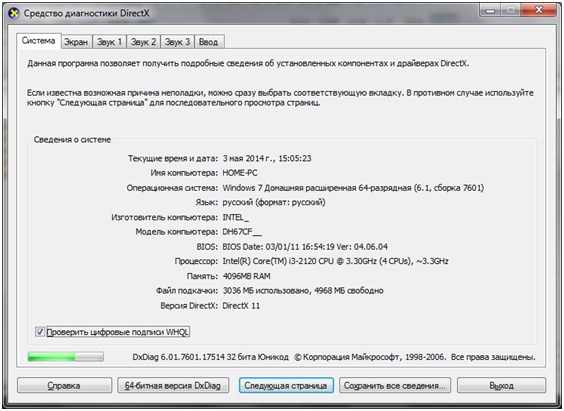 После нажатия на кнопку ОК откроется окно средств диагностики DirectX. Во вкладке система будет указана вся необходимая для пользователя информация. Если при запуске игры возникли неполадки или появилась системная ошибка, например что отсутствует d3dx9_43.dll, то протестировать модули на работоспособность можно именно здесь.