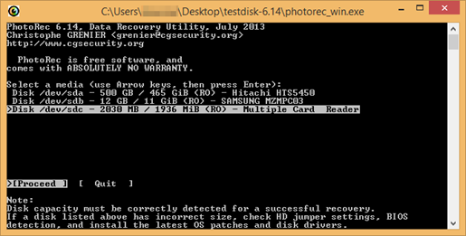Поскольку утилита не требует установки, загружаем Photorec_win.exe и видим перечень накопителей, из которого выбираем наш.