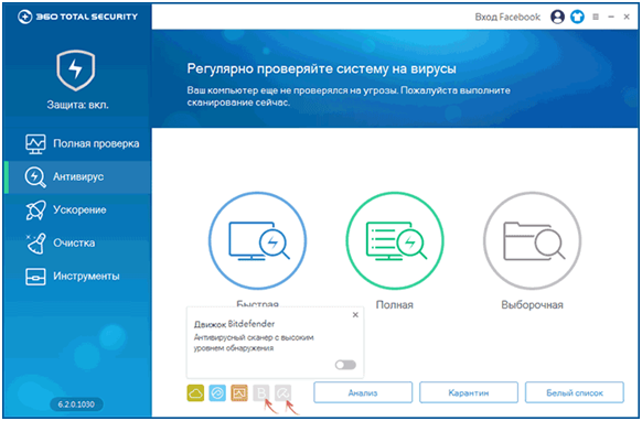 Разобравшись, как установить бесплатный антивирус 360 Total Security, поговорим о том, как работает программа. При первом запуске, приложение предложит просканировать систему. Рекомендуем выполнять полную проверку компьютера. В этом случае, будут выполнены следующие действия: