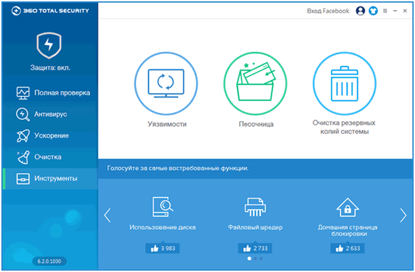 Расскажем, как пользоваться антивирусом 360 Total Security. Если перейти в раздел инструментов, увидим два пункта: уязвимости и песочница (отключен). В первом случае проводится анализ безопасности Windows и выявляются дыры в защите. Второй раздел запускает приложение в локальной среде, предотвращая установку нежелательного ПО.