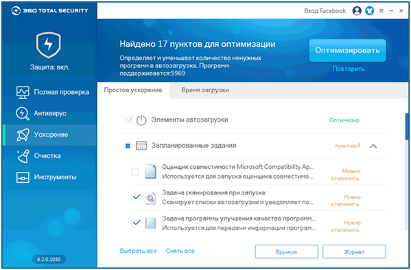 При переходе в раздел ускорения, антивирус проанализирует автозагрузку, запущенные службы и процессы, проверит настройку интернет-соединения. В результате на экран будут выведены обнаруженные недочёты и советы по оптимизации работы системы.