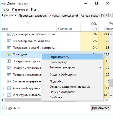 Когда не работает меню Пуск в Windows 10, самый простой и быстрый способ его «приручить» – это перезагрузить его. Для этого нам понадобится «Диспетчер задач». Запускаем его с помощью комбинации Ctrl+Alt+Delete – кому как привычнее, и переходим в «Процессы». Затем находим в списке Проводник, этоexplorer.exe, и жмем правую кнопку мыши. В появившемся окошке выбираем и кликаем «Перезапустить».