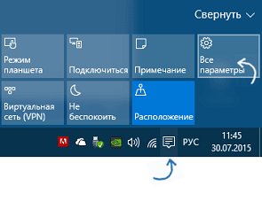 Когда ничего не помогает и пропал Пуск на Рабочем столе, остается только одно – сброс системы. Сделать это можно кликнув на значок уведомлений. В открывшемся меню выбираемВсе параметры, далее в пункте Обновление и безопасность находим «Восстановление».