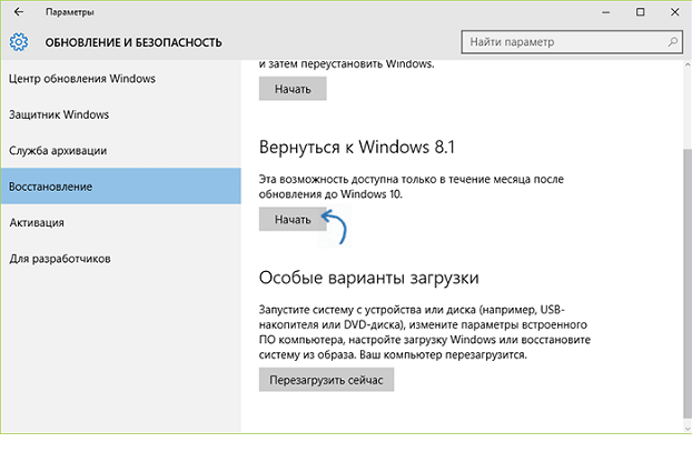 Если не открывается Пуск в Windows 10, вернуться к Виндовс 7 или 8.1 можно уже знакомым путем, через «Все параметры» и «Восстановление».