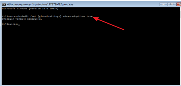 - В строке админа нужно ввести такую фразу «bcdedit /set {globalsettings} advancedoptions true». После этого клацаем «Enter».