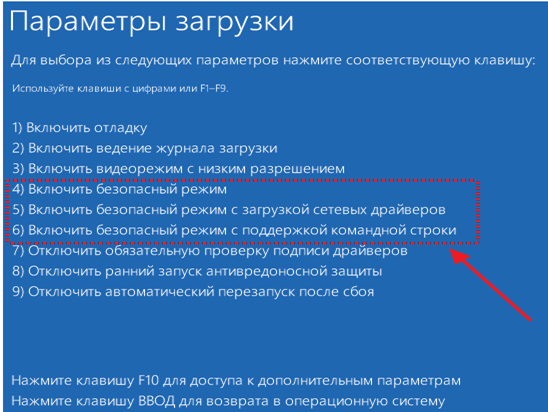 - Результат — автоматическая перезагрузка ПК. После включения ПК Вы увидите меню раздела параметров загрузки. С помощью пунктов 4, 5, 6 можно зайти в Safe Mode.