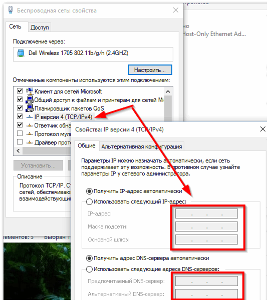 - Выполняем двойной клик по «IPv4» и перемещаем переключатели в положение: «Получить ip адрес автоматически» и «Получать адреса DNS автоматически».