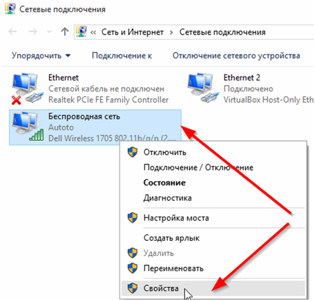 - Вызываем контекстное меню беспроводного соединения и выбираем «Свойства».