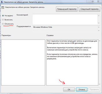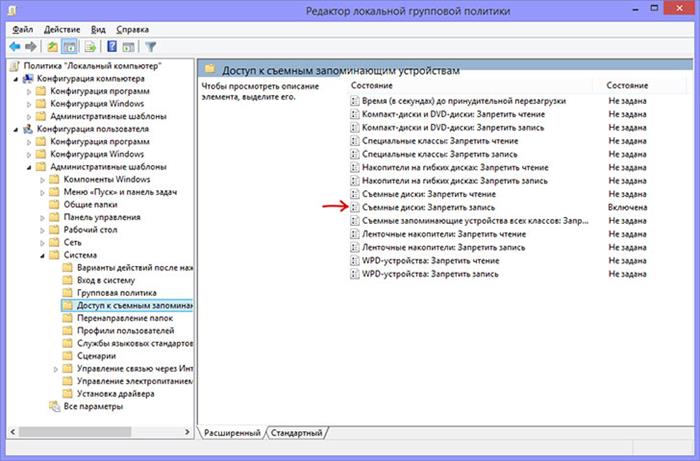 Здесь среди прочего имеется папка доступа к съемным ЗУ. Выбрав ее, в правой половине редактора появится перечень параметров. Если напротив запрета записи на съемные диски стоит значение «включена», требуется двойным щелчком левой кнопки мыши изменить параметр на противоположный – «отключена». Подтверждение изменений выполняется кнопкой «ок». Аналогично проверяются параметры чтения и копирования с запоминающих устройств.