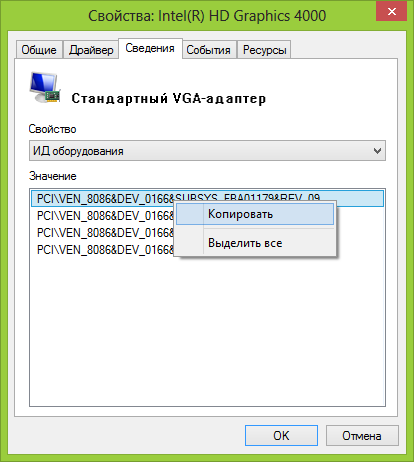 в меню «свойство» выбирается пункт «Ид оборудования»;
