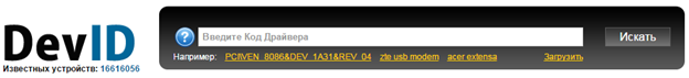 Имея Device ID, производится поиск на интернет-ресурсе devid.info/ru. Здесь в верхней части странички имеется поисковое поле, куда вставляется скопированный идентификатор оборудования. После этого нажимается «искать».