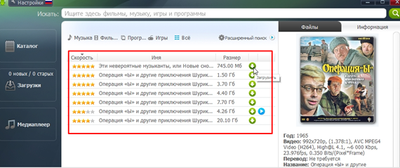 После нажатия на кнопку «Найти» в специальном окне пользователю предоставляется информация о нужном фильме, аудио, игре или программе. Также можно ознакомиться с описанием искомого объекта и с картинкой обложкой, чтобы убедиться в правильности найденных данных.