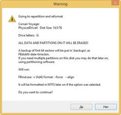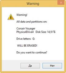 Осталась последняя кнопка «Go», после нажатия на которую откроется два окна с предупреждениями о возможной потере файлов на флешке. Отвечаем утвердительно, поскольку мы уже отформатировали накопитель, и он полностью пустой.