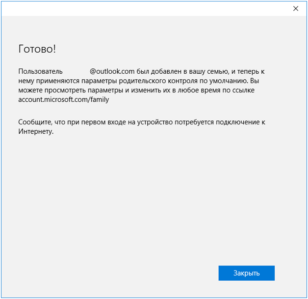 После создания учетки покажется информация о ней и данные по дальнейшему управлению. Стоит знать, что для настройки придется переходить на сайт Майкрософт из аккаунта родителя. Ссылка для доступа будет показана в конце настроек.