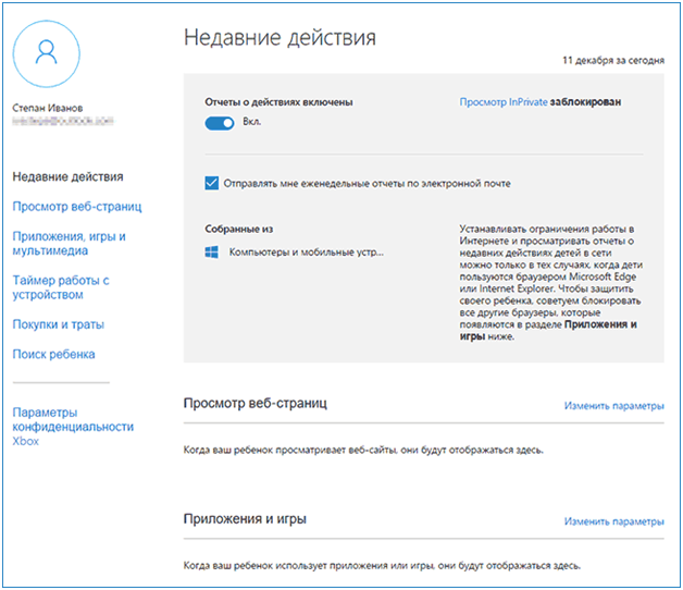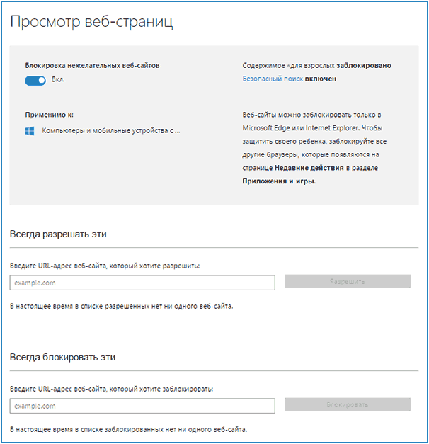 Функция управления просмотром страниц. Она позволяет оградить детей от нежелательного контента и по умолчанию всегда включена. В стандартных настройках включен еще и безопасный поиск. Стоит знать, что работает просмотр и отслеживание загрузок в Internet Explorer и Edge. Блокировки распространяются только на эти браузеры и не работают в других.