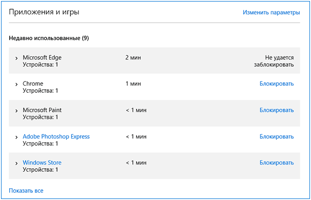 В разделе «Приложения и игры» появляются все запущенные программы в учетной записи ребенка. Их допускается запрещать. Но в списке они отображаются только после первого запуска. Поддерживается еще блокировка по возрасту, ориентированная на магазин приложений Windows 10.
